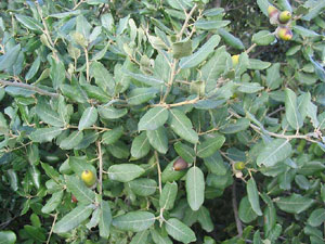 tronc court et souvent tortueux, feuilles alternes, coriaces, petites (longues de 3-9 cm) de forme variable (entières, dentées ou épineuses) avec un pétiole court, vert foncé, luisantes sur le dessus, pubescentes et blanchâtres dessous. Fleurs unisexuées, les mâles sont très abondantes. Ce sont des chatons pendant à la base des pousses de l'année, les glands sont bruns de dimension variant de 1 à 3 centimètres de long.